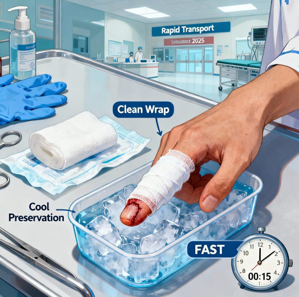 - 병원 도착 전, 절단 조직을 어떻게 보관했는지(포장 방식, 냉각 여부)를 의료진에게 상세히 알려야 합니다.