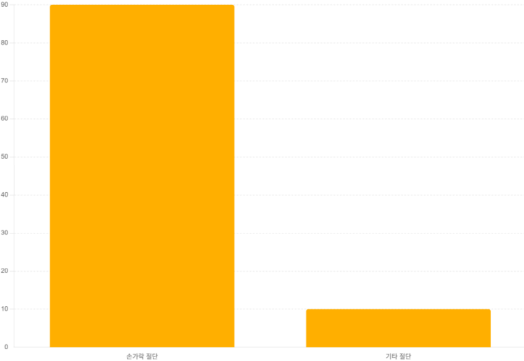 한국의 절단 사례 중 상지(특히 손가락) 절단 비중이 매우 높다는 보고가 있습니다. 한 국가 데이터 분석에서 인구 10만명당 약 38.3건의 절단이 발생했고, 이 중 손가락(수지) 절단이 전체의 90% 이상을 차지한다고 보고되었습니다. 즉, 손가락 절단은 드문 사고가 아니라 산업·가정·레저 활동 등에서 비교적 자주 일어나는 외상입니다.