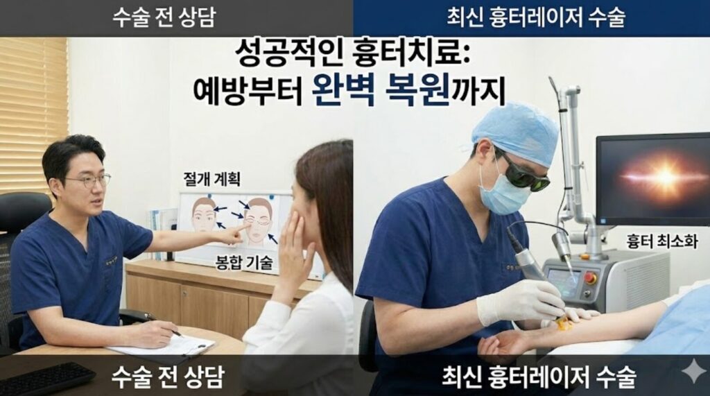 성공적인 흉터 치료의 핵심은 수술 전부터 시작됩니다. 흉터가 걱정된다면, 수술을 계획하는 단계부터 성형외과 전문의 등 의료진과 충분한 상의를 통해 절개 방향이나 봉합 기술 등 흉터 최소화를 위한 계획을 세우는 것이 중요합니다. 하지만 이미 발생한 수술 후 흉터라 할지라도, 최신 흉터레이저 수술을 통해 충분히 완벽에 가깝게 지워낼 수 있습니다.